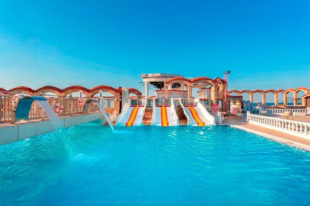 aktivitetsbasseng og et saltvannsbasseng med tre mindre vannsklier. Det finnes