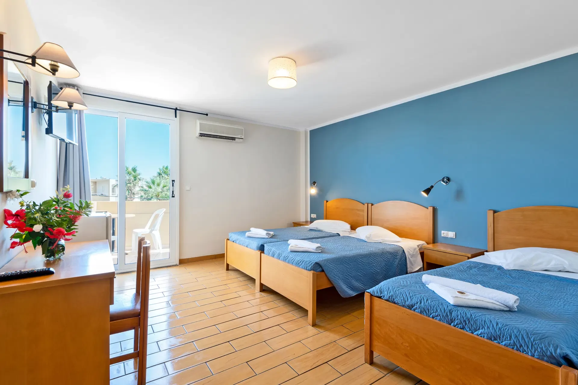 Et klimaanlegg sørger for et behagelig inneklima på rommene. På balkongen eller den private terrassen utenfor de fleste rom kan gjestene slappe av og nyte havutsikten. Separate soverom er også en bekvemmelighet som kan bestilles. Rommene har kjøleskap, telefon, TV med satellittkanaler og en safe. På badet – som er utstyrt med dusj – er en hårføner tilgjengelig. For foreldre med barn er familierom tilgjengelig.